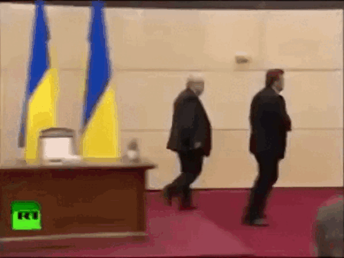 Viktor Yanukovych and another man walk away on a red carpet, with a Ukrainian flag in the background.