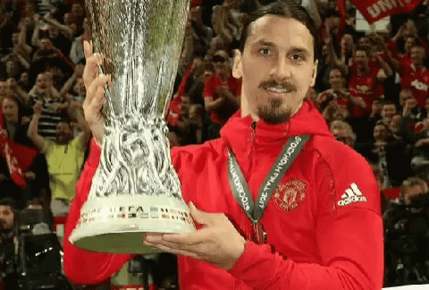 Zlatan Ibrahimović celebrates with the Europa League trophy, wearing a red Adidas Manchester United jacket.