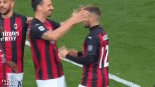 Zlatan Ibrahimović and Ante Rebić celebrate a goal, hugging on the football pitch with teammates.