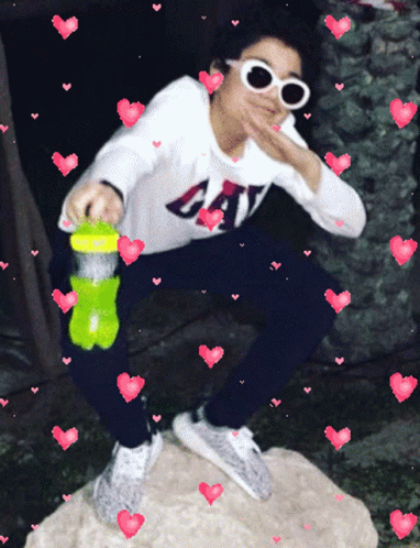 Ibrahim Khalifa poses confidently in sunglasses and a GAP shirt, holding a green bottle.