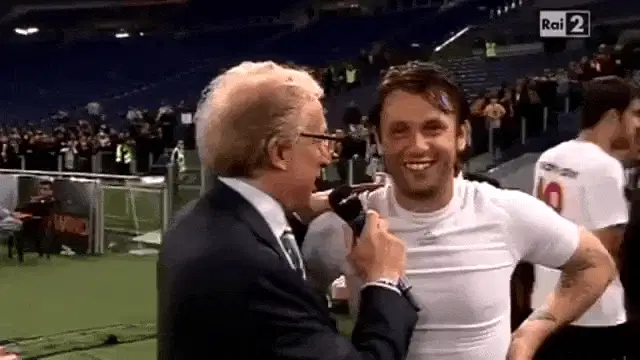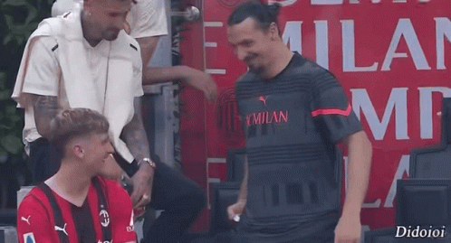 Zlatan Ibrahimovic smiling and interacting with a teammate in an AC Milan jersey.
