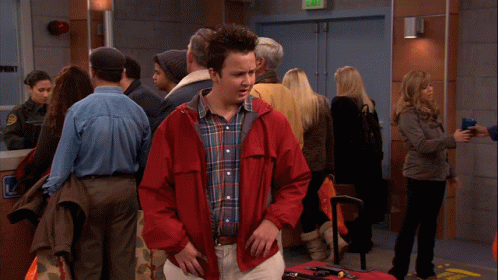 iCarly's Gibby, played by Noah Munck, stands in a red jacket in a crowded area.