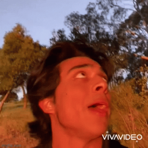 Icecold Jt looks up at the sky with his mouth open in a field during sunset.