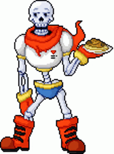 Papyrus from Undertale in his iconic pixel art idle stance, holding a plate of spaghetti with his cape blowing.