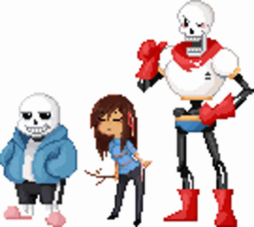 Pixel art animation featuring Sans, Papyrus, and Frisk from Undertale in their characteristic idle poses.