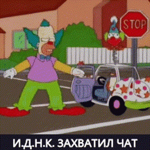 IDNK clowns from The Simpsons take over the chat, featuring Krusty and other clowns in a chaotic street scene.