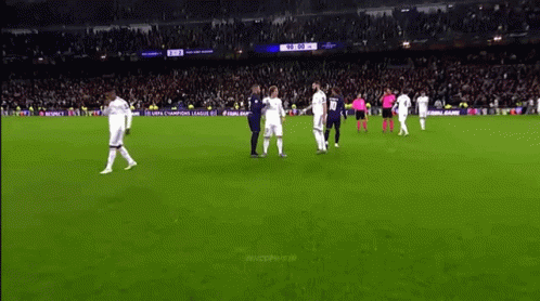 Karim Benzema and Kylian Mbappé interact on the field after a UEFA Champions League match between Real Madrid and PSG.