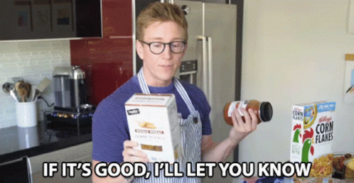 Tyler Oakley holds a jar and a box of food, promising to share his review if the product is good.