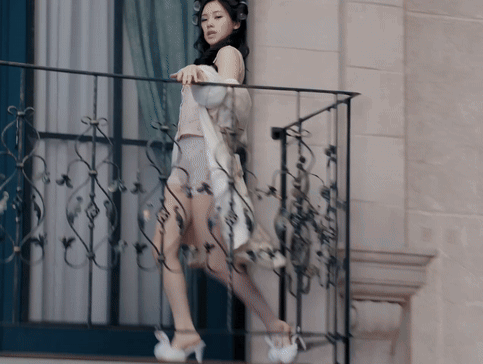 a woman is standing on a balcony with a wrought iron railing behind her