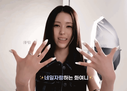 Ifeye Hwayeon smiles brightly, showcasing her long, stylish white nails to the camera.