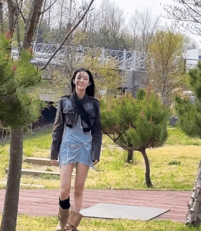 a woman in a denim skirt and brown boots is standing in a park