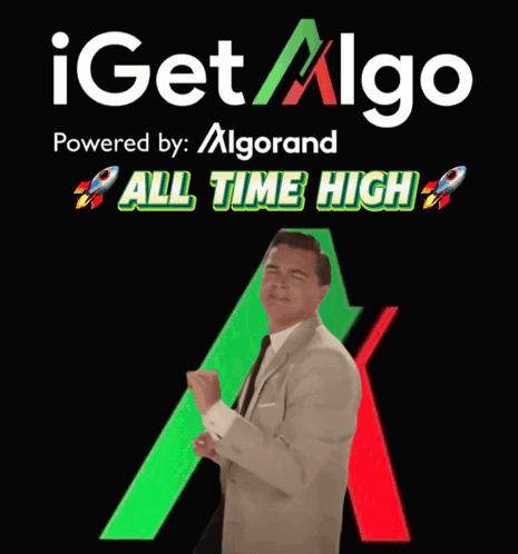 Man in a suit dances in front of an 'All Time High' sign, celebrating iGetAlgo and Algorand.