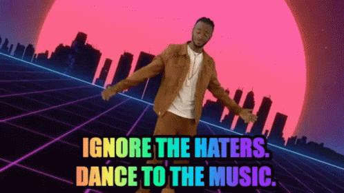 A man with dreadlocks dances energetically against a retro-futuristic background with the message 'Ignore the haters. Dance to the music.'