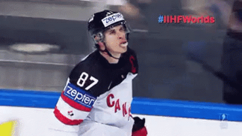 Sidney Crosby, wearing his iconic number 87 jersey for Team Canada, on the ice during an IIHF World Championship game.