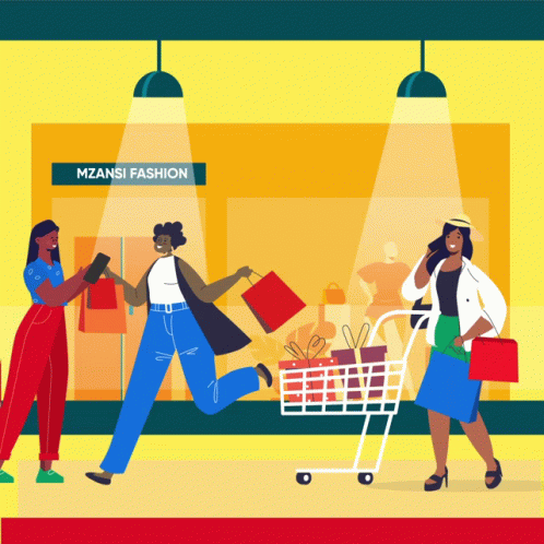 Three women enjoy a vibrant shopping spree at Mzansi Fashion, connected by Ikeja Ikejawifi and mobile phones.