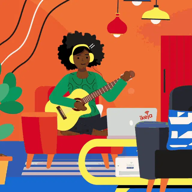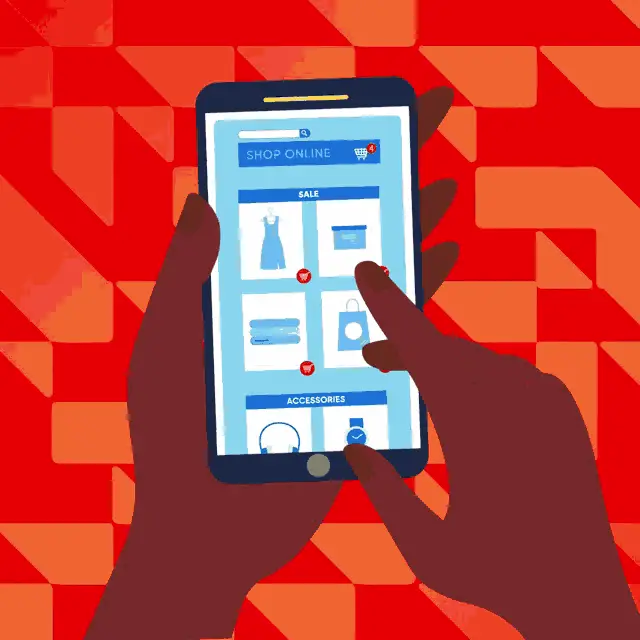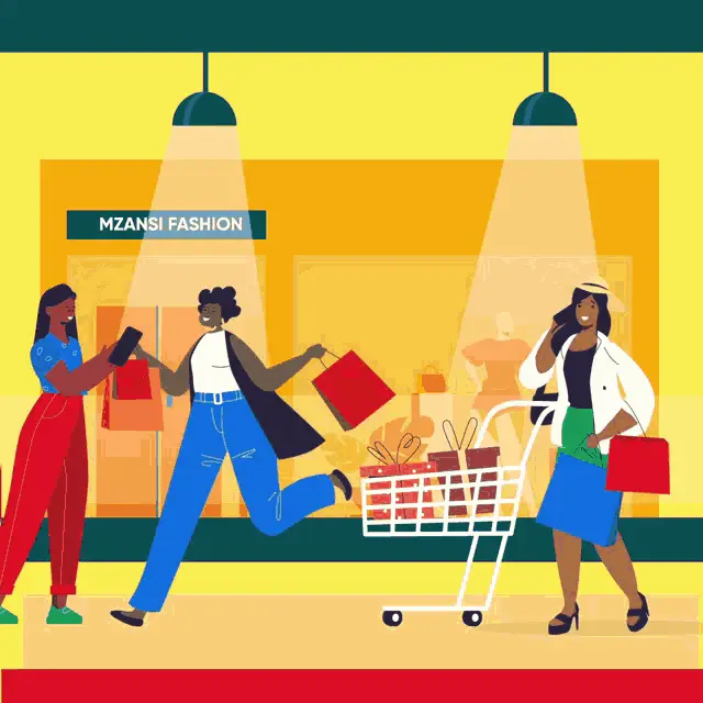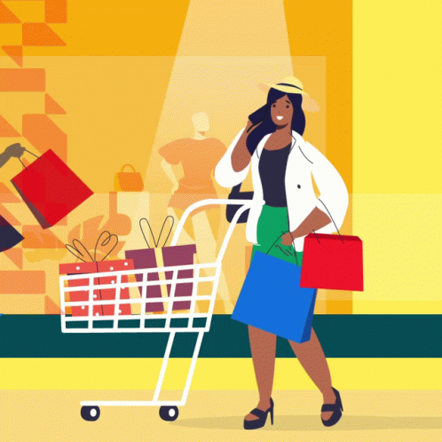 A lady shops in Ikeja, talking on her phone while pushing a cart full of shopping bags and gifts.