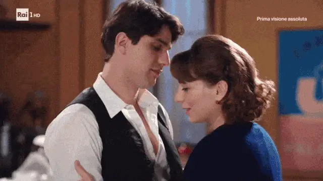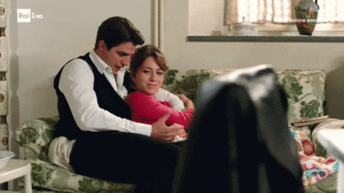 Federica De Benedettis and Pietro Masotti from Il Paradiso Delle Signore share a tender moment on a couch.