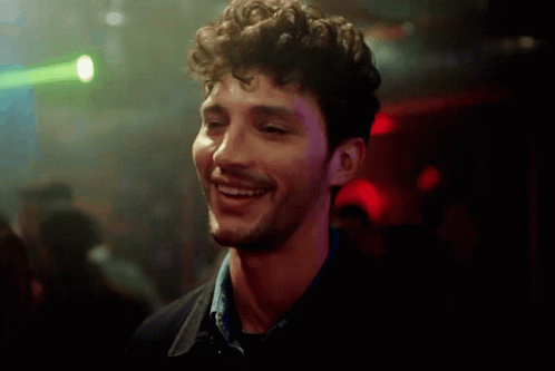 İlhan Şen with curly hair smiles charmingly in a dimly lit club with colorful lights.