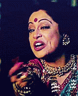 Kirron Kher delivers a fierce line, expressing anger with intense facial expressions and gestures.