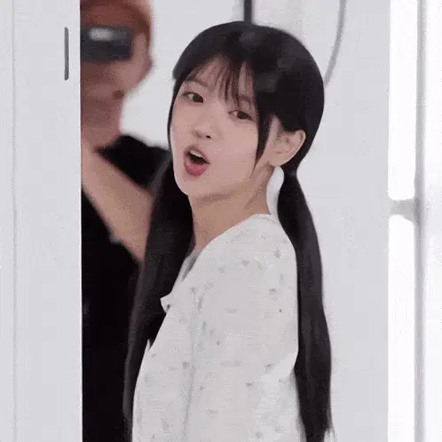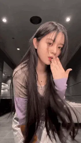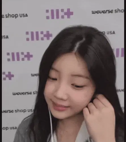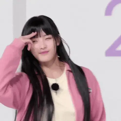 K-pop idol Moka from ILLIT posing in denim overalls and a plaid shirt against a vibrant pink background.