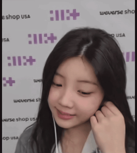 ILLIT's Wonhee smiles sweetly while wearing headphones, with 'Weverse Shop USA' in the background.