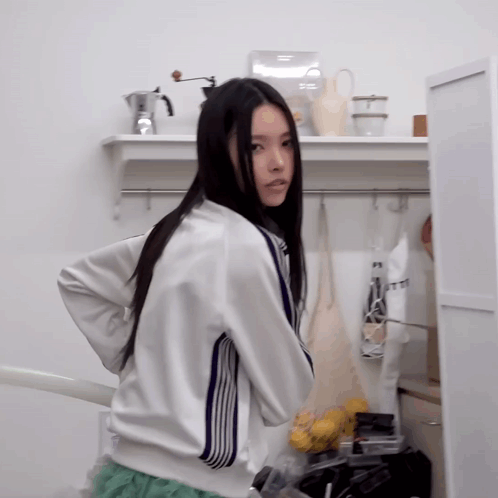 a woman in a white jacket stands in a room