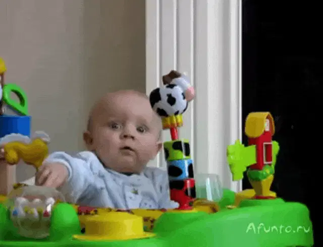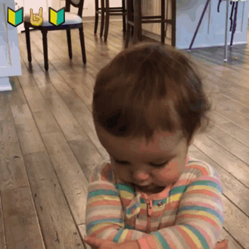A baby with brown hair, wearing a colorful striped shirt, sits on a wooden floor, looking down sadly.