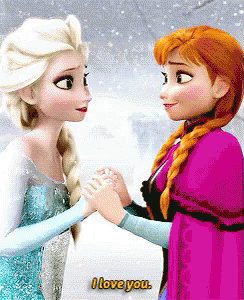 Elsa and Anna from Frozen holding hands, with the caption 'I love you' displayed.