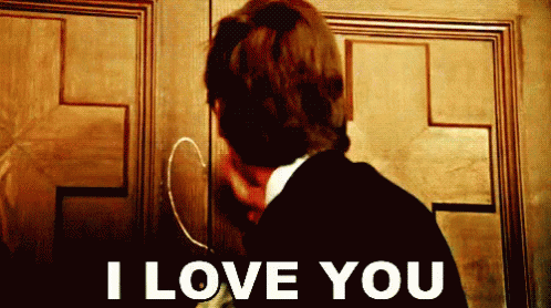A man in a suit knocks on a door, with the words "I LOVE YOU" displayed, referencing The Rocky Horror Picture Show.