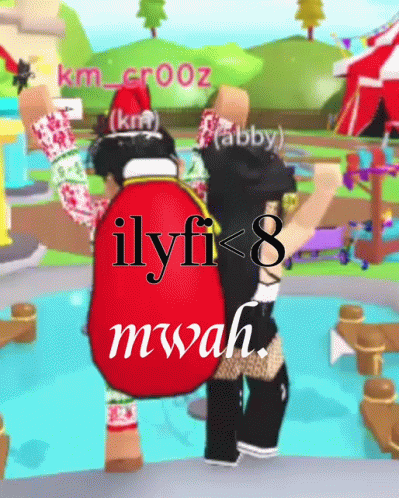 Two Roblox avatars, km_cr00z and abby, dance with a red bag, expressing affection with "ilyfi<8 mwah."