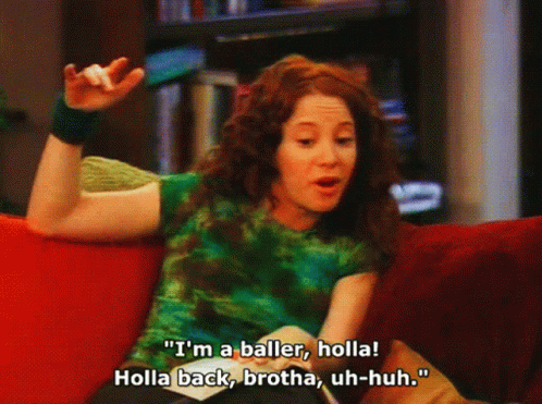 A woman on a red couch declares, 'I'm a baller, holla! Holla back, brotha, uh-huh.'