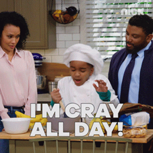 Myles Wilson, dressed as a chef, energetically declares 'I'm Cray All Day!' in a fun kitchen scene, referencing Charlie Wilson.