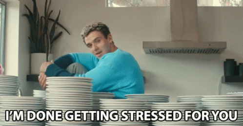 Lauv, in a blue sweater, sits amidst stacks of dishes, singing the lyric "I'm done getting stressed for you."
