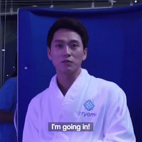Man in a white Cryome robe prepares to enter a blue cryotherapy chamber, saying 'I'm going in!'
