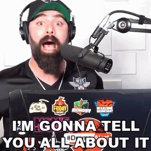 Keemstar, wearing headphones, excitedly declares, 'I'm gonna tell you all about it' into a microphone.