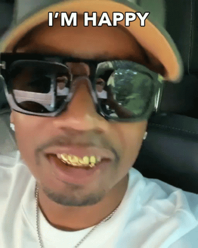 Plies, wearing sunglasses and a hat, expresses happiness with 'I'm Happy' text overlay, showing a positive mood.