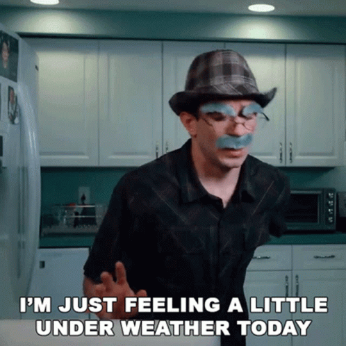 Anthony Mennella, wearing a hat and fake mustache, expresses he's feeling a little under the weather.