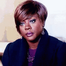 Viola Davis, with short brown hair, reacts with a mad and offended expression, looking up from a downward gaze.