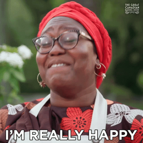 Raufikat expresses her happiness on The Great Canadian Baking Show, smiling brightly with the show's logo visible.