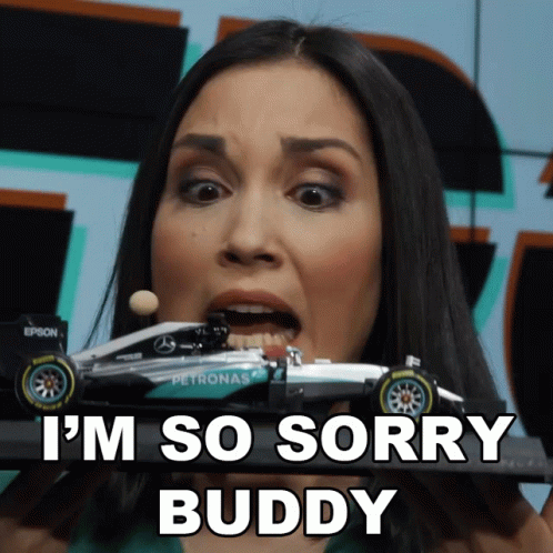 Stefanie Langer holds a toy Mercedes-AMG Petronas F1 race car, with the caption 'I'm So Sorry Buddy'.