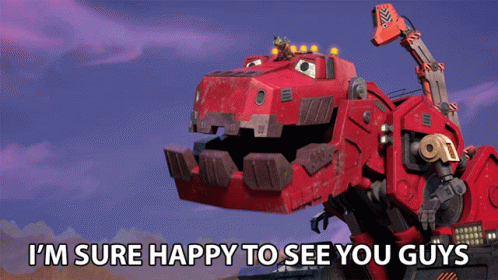 Ty Rux from Dinotrux expresses his delight, saying 'I'm sure happy to see you guys!'