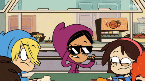 Ronnie Anne Santiago points and removes sunglasses, giving an 'I'm watching you' look at the cafeteria table.