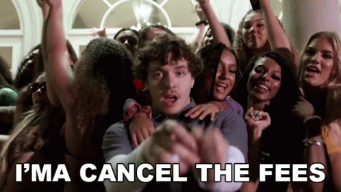 Jack Harlow, surrounded by a crowd, declares 'I'ma Cancel The Fees' in a music video clip.