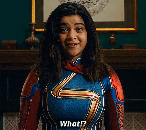Iman Vellani as Ms. Marvel (Kamala Khan) looks confused and asks, 'What!?'