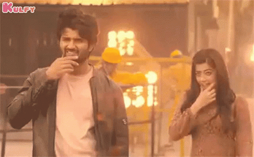 Vijay Devarakonda and Rashmika Mandana playfully imitate movie scenes, reacting with surprise.