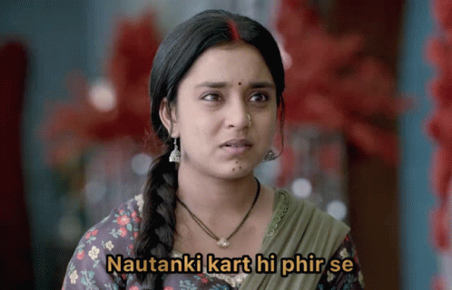 Imlie, a woman wearing a necklace and earrings, reacts with the Hindi phrase 'Nautanki kart hi phir se' (Doing drama again).