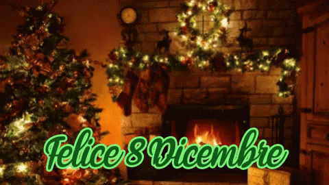 A festive Christmas scene with a fireplace and tree, celebrating 'Felice 8 Dicembre' (Happy December 8th).