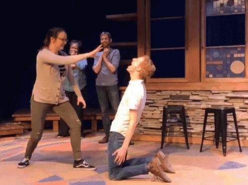 Four people on stage performing an improv scene, with one man kneeling and falling.