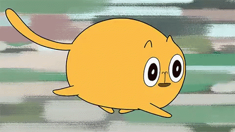 A cute, round yellow cartoon cat with big eyes quickly runs across the screen, appearing to be in a rush.