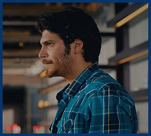 Can Yaman as Yalin Aras from 'Inadina Ask' (Love In Spite) turns his head, looking intense in a plaid shirt.